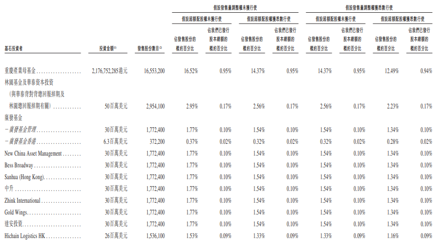 其中,New China Asset Management由新华人寿保险股份有限公司(简称“新华保险”,1336.HK,601336.SH)直接及间接持股99.6%;Sanhua (Hong Kong)由浙江三花智能控制股份有限公司(简称“三花智控”,002050.SZ,02050.HK)间接全资拥有;中升由中升控股(00881.HK)间接全资拥有;Hichain Logistics HK最终控股公司为江苏海晨物流股份有限公司(简称“海晨股份”300873.SZ);中邮理财由中国邮政储蓄银行股份有限公司(简称“邮储银行”,01658.HK,601658.SH)100%持股;星宇香港由常州星宇车灯股份有限公司(“星宇股份”,601799.SH)全资拥有。