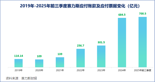 赛力斯资产质量很高,2025年三季度末,公司1215亿总资产中,包含着约595亿的货币资金。细看财报不难发现,赛力斯同期应付账款及应付票据之和,高达700.54亿;应收账款仅有19.55亿,形成强烈反差。