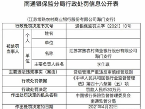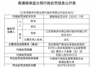 2021年4月,因贷后管理严重违反审慎经营规则,常熟银行海门支行和启东支行分别被罚30万元、25万元。