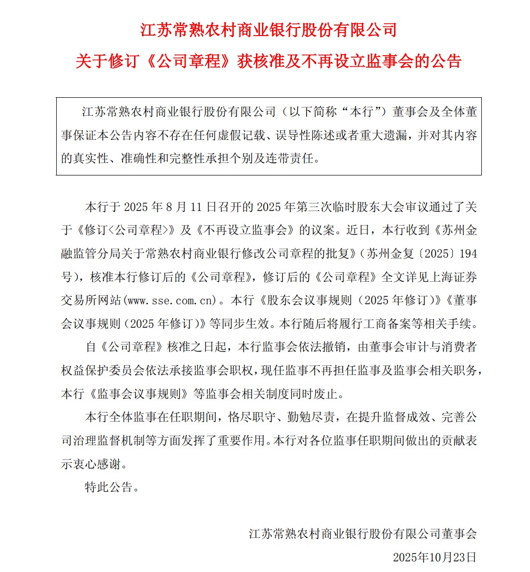 10月23日,常熟银行发布公告称,已于近日收到《苏州金融监管分局关于常熟农村商业银行修改公司章程的批复》。自《公司章程》核准之日起,常熟银行监事会依法撤销,现任监事不再担任监事及监事会相关职务,该行《监事会议事规则》等监事会相关制度同时废止。