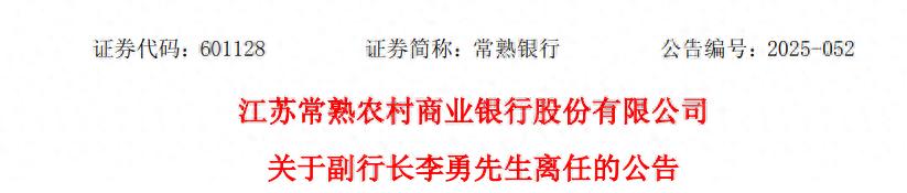 公告显示,常熟银行副行长李勇因工作变动,于当日起辞去副行长职务,辞任后不再担任常熟银行任何职务。李勇原定任期到期日为2026年12月28日,已按规定做好交接工作,不存在未履行完毕的公开承诺。