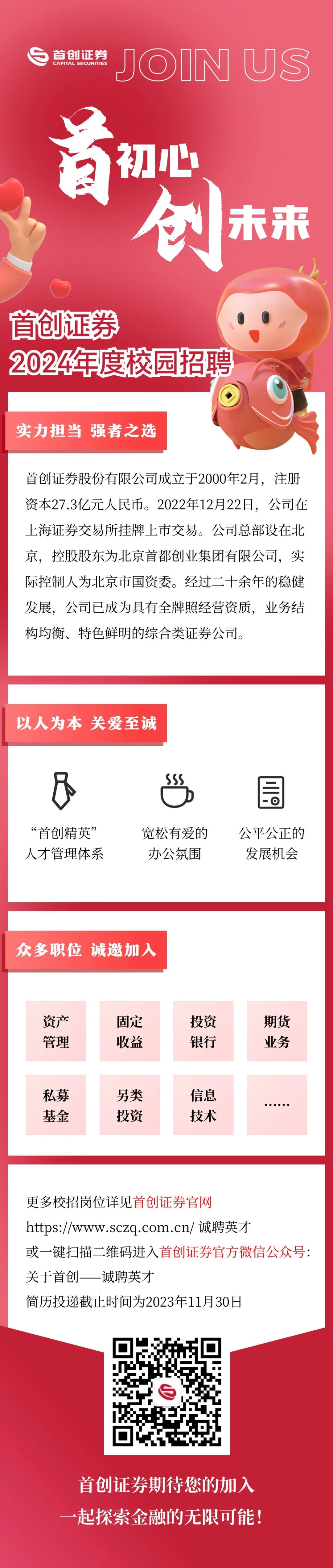 首创证券股份有限公司成立于2000年2月,注册资本27.3亿元人民币。2022年12月22日,公司在上海证券交易所挂牌上市交易(证券代码“601136”)。公司总部设在北京,控股股东为北京首都创业集团有限公司,实际控制人为北京市国资委。现因公司业务发展需要,特招聘品学兼优、有志于投身证券行业的在校学生。公司将以“首创精英”人才管理体系为核心,为员工提供宽松有爱的办公氛围和公平公正的发展机会。