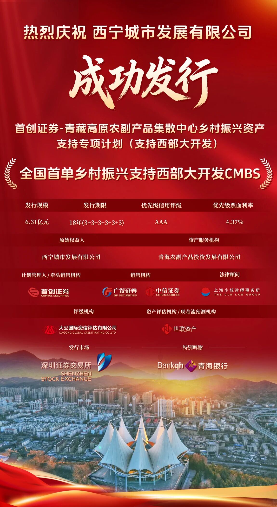 2026年2月4日,由首创证券担任计划管理人及销售机构的“首创证券-青藏高原农副产品集散中心乡村振兴资产支持专项计划(支持西部大开发)”正式设立。该产品系全国首单乡村振兴叠加西部大开发战略的CMBS(商业房地产抵押贷款支持证券),也系原始权益人西宁城市发展有限公司在公开资本市场的首次亮相。本次CMBS的成功设立,为其拓展融资渠道、盘活国有资产、优化债务结构迈出关键一步。