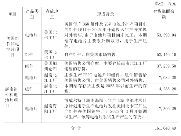 针对越南海阳工厂电池片,公司本期计提减值准备金额为2,557.86万元。该等电池片系博威尔特(越南海阳)年产3GW电池片项目2025年3至4月调试生产的产品。公司原计划将越南海阳工厂生产的电池片发往美国北卡工厂用于生产组件向美国市场销售,2024年,受美国对东南亚四国加征双反关税的政策影响,公司主动调整经营策略适当放缓项目建设速度,并于2024年下半年起对海外光伏产能布局开展前瞻性研究与调研工作。