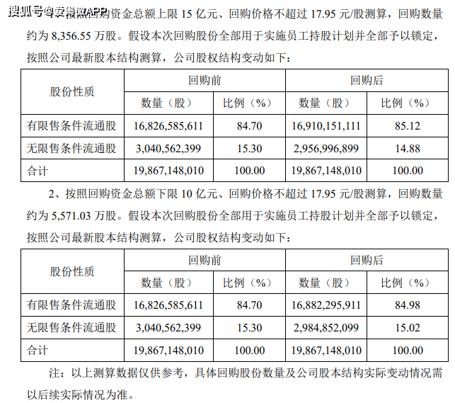 根据计划,此次回购股份的价格为不超过17.95元/股,若按照回购资金总额上限测算,预计可回购数量约为8,356.55万股,约占公司目前总股本的0.42%;若按照回购资金总额下限测算,预计可回购数量约为5,571.03万股,约占公司目前总股本的0.28%。