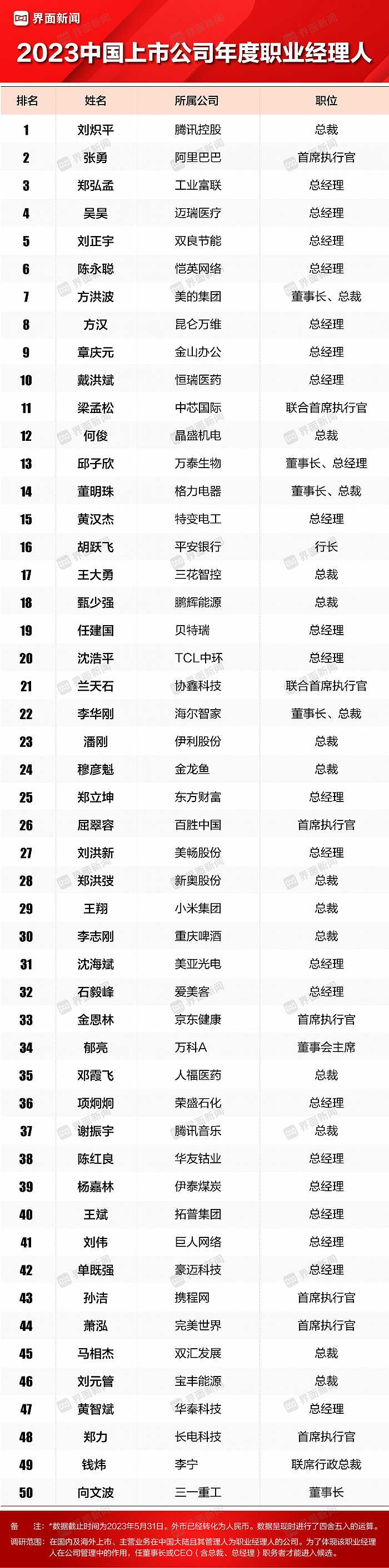 6月29日,界面新闻发布2023中国上市公司年度职业经理人榜单,腾讯控股刘炽平、阿里巴巴张勇、工业富联郑弘孟位居前三。