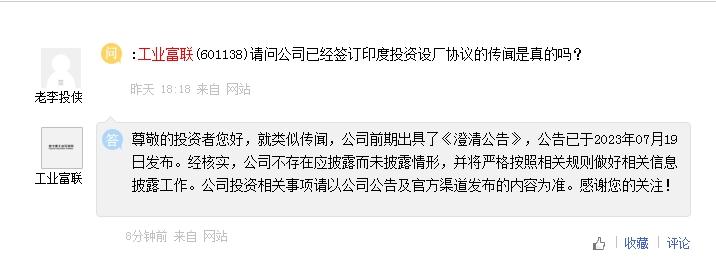 针对投资者关于已经签订印度投资设厂协议的传闻是否为真的提问,工业富联表示,就类似传闻,公司前期出具了《澄清公告》,公告已于2023年7月19日发布。经核实,公司不存在应披露而未披露情形,并将严格按照相关规则做好相关信息披露工作。