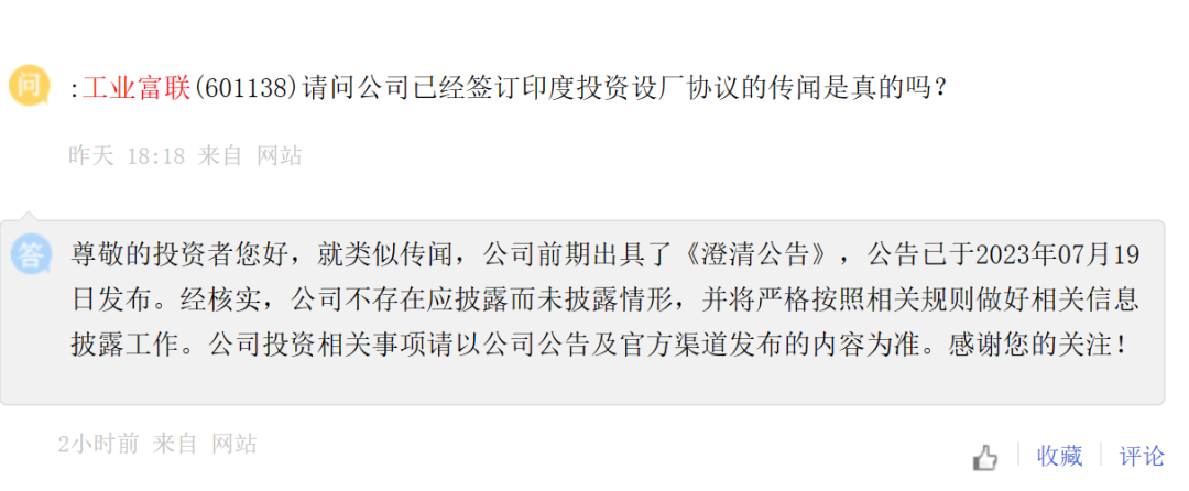 具体来看,7月31日,有媒体报道,印度南部泰米尔纳德邦政府周一(7月31日)表示,富士康旗下子公司工业富联已与泰米尔纳德邦签署了一项协议,将投资160亿卢比(合1.94亿美元)新建一个电子元件制造工厂。上述传闻引发了投资者关注,并在投资者互动平台向工业富联发起了相关提问。对此,8月1日早间,工业富联在互动平台回复投资者称:就类似传闻,公司前期出具了《澄清公告》,公告已于2023年7月19日发布。经核实,公司不存在应披露而未披露情形,公司投资相关事项请以公司公告及官方渠道发布的内容为准。