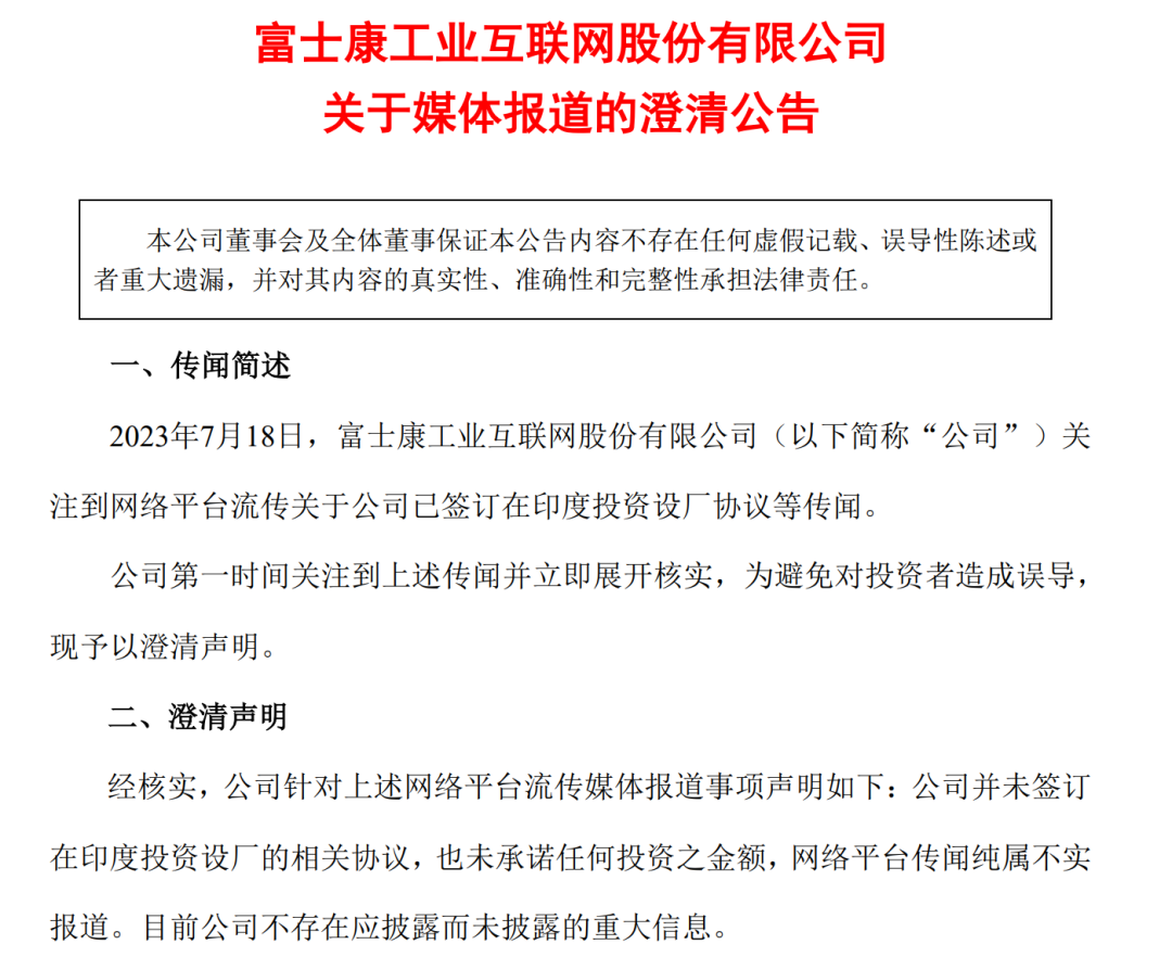 回查公司7月19日公告,当时,工业富联披露,公司关注到网络平台流传关于公司已签订在印度投资设厂协议等传闻。经核实,公司针对上述网络平台流传媒体报道事项声明如下:公司并未签订在印度投资设厂的相关协议,也未承诺任何投资之金额,网络平台传闻纯属不实报道。目前公司不存在应披露而未披露的重大信息。