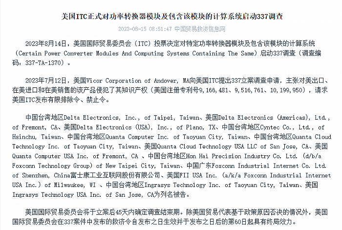 据中国贸易救济信息网,8月14日,美国国际贸易委员会(ITC)投票决定对特定功率转换器模块及包含该模块的计算系统(Certain Power Converter Modules And Computing Systems Containing The Same)启动337调查(调查编码:337-TA-1370)。