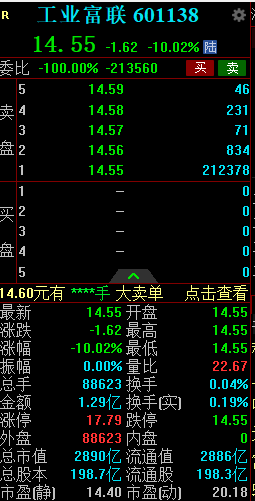 10月23日消息,工业富联竞价跌停,截至发稿,股价报14.55元,集合竞价成交1.29亿元,封单21万手。最新总市值2890亿元。