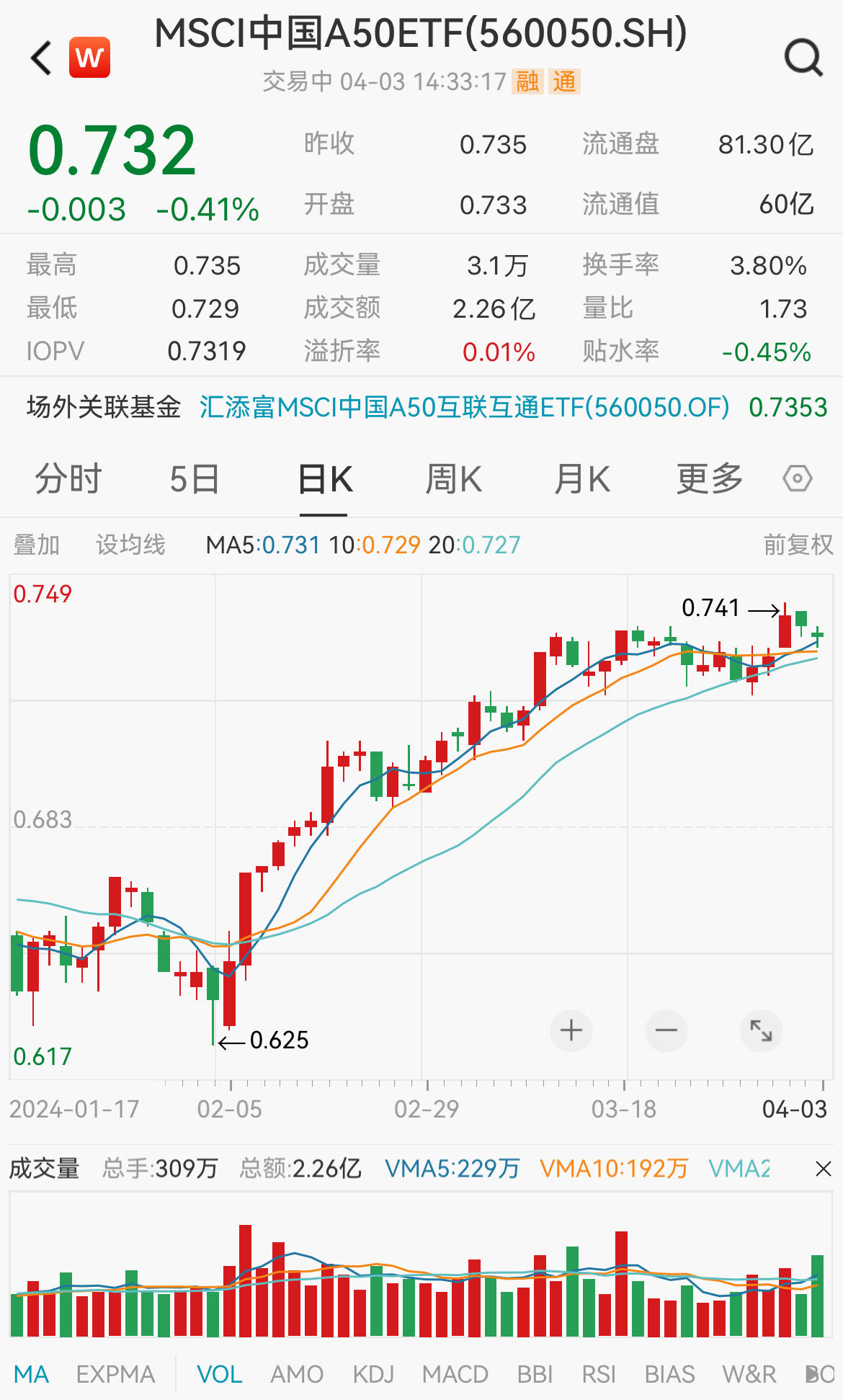 截至2024年4月3日14:33,MSCI中国A50ETF(560050)下跌0.41%,最新报价0.73元,盘中成交额已达2.26亿元,换手率3.80%。跟踪指数成份股紫金矿业、牧原股份涨超2%,陕西煤业、中国石油、京东方A、中国神华、美的集团、泸州老窖等个股跟涨,工业富联跌逾4%,万科A、国电南瑞、宁波银行、比亚迪、片仔癀等个股跟跌。