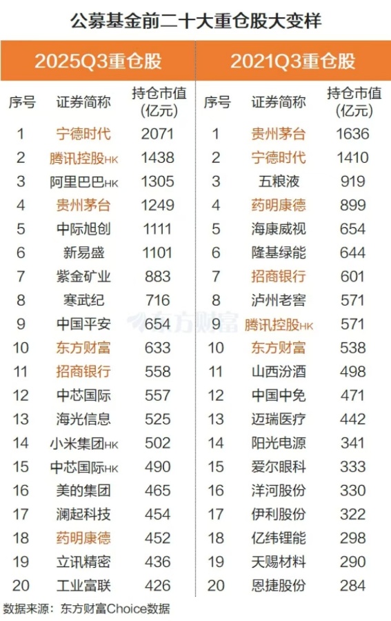 对比2021年与2025年三季度的公募基金重仓榜,最大的变化在于资金流向的结构性转移。过去的“白酒+银行”组合正在让位于“算力+光模块+半导体”的新核心。