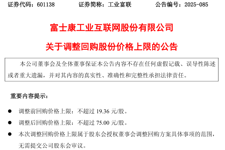 因 工业富联 实施2024年年度权益分派,上述股份回购价格上限由不超过20元/股调整为不超过19.36元/股,调整后的回购价格上限于2025年7月31日起生效。