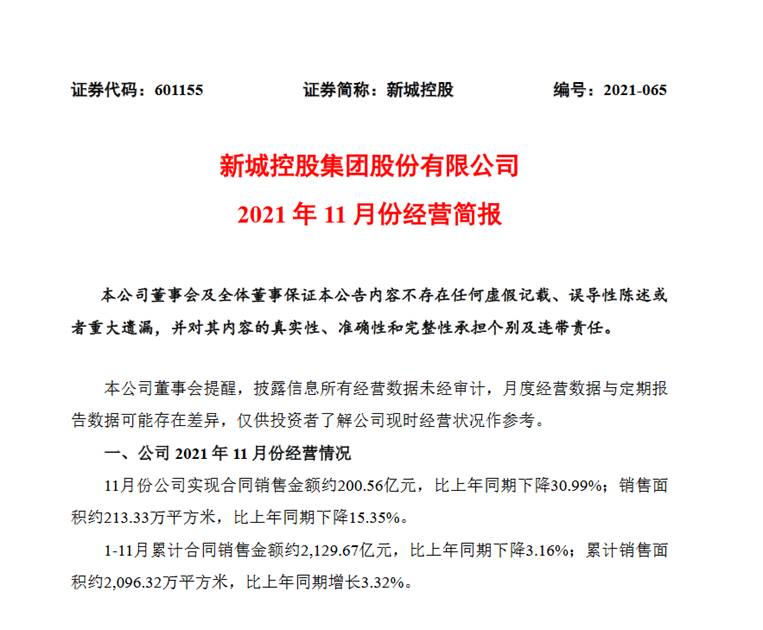 12月1日,新城控股(601155.SH)发布《2021年11月份经营简报公告》。据公告披露,2021年11月单月,新城控股实现合同销售金额约200.56亿元,较上年同期下降30.99%;销售面积约213.33万平方米,较上年同期下降15.35%。