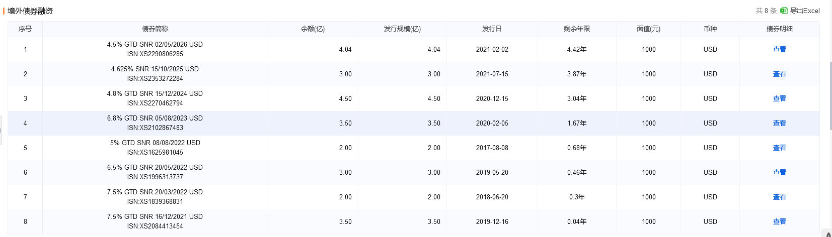 截至目前,新城控股尚在存续期的境外债有8只,合计25.54亿美元。其中,其中2019年12月16日发行的一笔3.5亿美元的债券,票面利率为7.5%,债券余额为3.5亿美元,将于2021年12月16日到期;此外,新城控股现存人民币债券24只,债券存量规模达205.63亿元。其中私募债96.31亿元,占比46.84%。