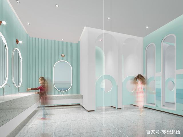 运用细节转变创造乐趣,在不同的儿童厕所选用Tiffany绿与白色相衬的:一间以马赛克磁砖壁面搭配外星人壁饰;另一间则以纵向线条搭配矮拱门,打造儿童喜爱的空间。