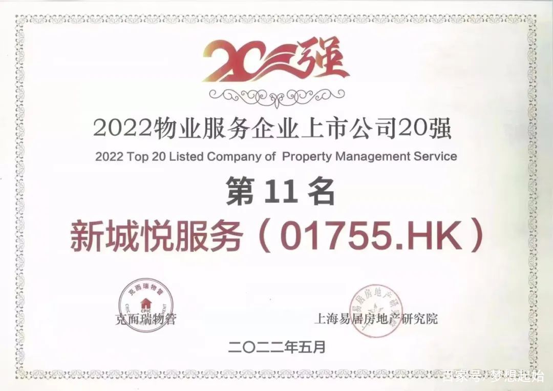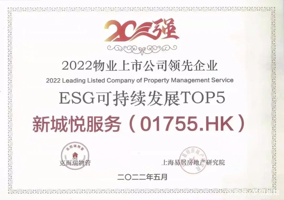近日,新城悦物业服务再传喜讯,荣获“2022物业上市公司领先企业ESG可持续发展TOP5”、“2022物业上市公司领先企业发展速度TOP5”、“2022物业服务企业上市公司TOP11”三项荣誉。