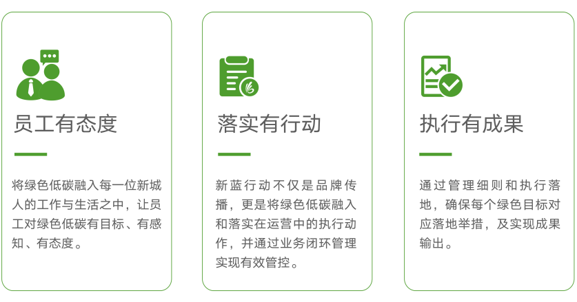 “员工有态度、落实有行动、执行有成果”,新城实施“3有原则”,坚持覆盖每一人、落实每一细节、贯穿全年度,让新蓝行动真正深入人心。
