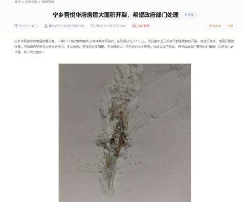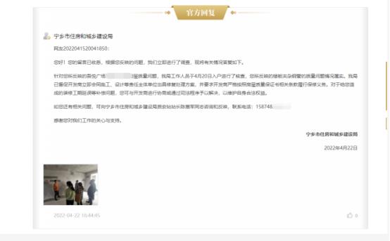 随后,宁乡市住房和城乡建设局立即对宁乡吾悦华府(吾悦广场住宅)进行了调查,并于2021年10月28日在《百姓呼声》上进行了公开回复,回复称,经核查宁乡吾悦广场一期整体交付1453户,当前业主办理收房681户,其中反馈楼板开裂并在物业处报修的61户,根据要求建设单位已委托原设计单位出具处理意见,已有效处理43户,剩余18户因业主对处理方式存在异议,根据业主意见正在安排做第三方实体检测,根据检测结论出具业主认可的维修方案。