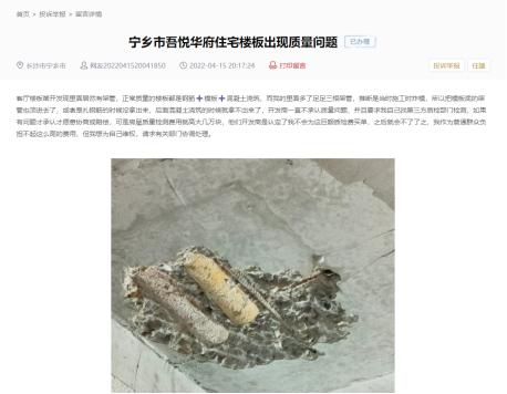 其中,2022年4月15日,有网友投诉宁乡吾悦广场住宅(吾悦华府),称业主凿开客厅楼板发现楼板内部有架管,业主推测是吾悦施工程序或品控不达标。随后宁乡市住房和城乡建设局在《百姓呼声》官网进行回复,通过组织专业机构实地检测,确认楼板夹杂钢管的质量问题情况属实,并督促开发商立即会同施工、设计等责任主体单位出具修复处理方案,并要求开发商严格按照房屋质量保证书相关条款履行保修义务。