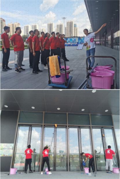 工程物业管理的精细化不仅要为广场消防安全保驾护航,还要注重现场环境品质。“围栏玻璃刮洗”环节中,物业同事们熟练使用各种清洁工工具,按照精细化标准刮洗围栏玻璃,坚决不放过任何一个清洁死角。