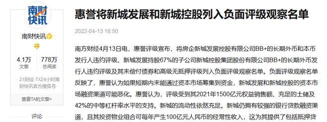 4月13日,惠誉宣布,将新城控股的评级BB+的长期外币和本币发行人违约评级、新城发展持股67%的子公司新城控股集团股份有限公司BB+的长期外币发行人违约评级及其未偿付债券和高级无抵押评级列入负面评级观察名单。
