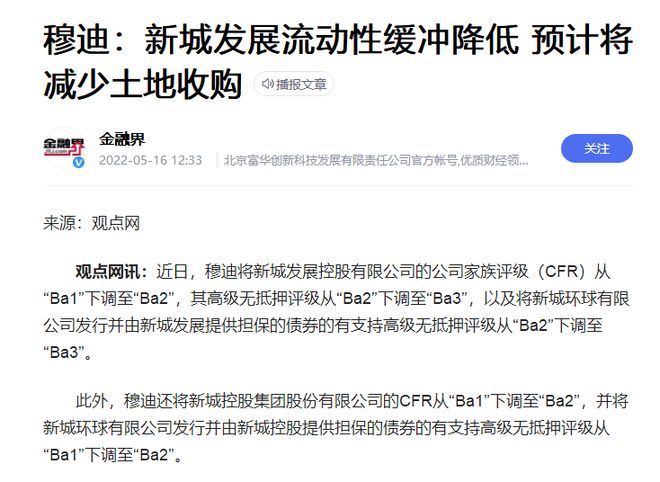 5月16日,穆迪将新城发展控股有限公司的公司家族评级(CFR)从“Ba1”下调至“Ba2”,其高级无抵押评级从“Ba2”下调至“Ba3”,以及将新城环球有限公司发行并由新城发展提供担保的债券的有支持高级无抵押评级从“Ba2”下调至“Ba3”。同时,穆迪已将上述所有评级列入进一步下调观察名单中,评级展望从负面调整为评级列入观察名单。