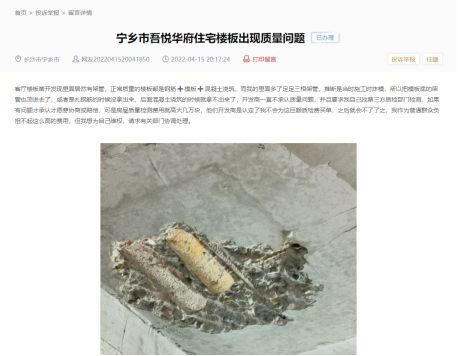 2022年4月15日,有网友投诉宁乡吾悦广场住宅(吾悦华府),称业主凿开客厅楼板发现楼板内部有架管,业主推测是吾悦施工程序或品控不达标。随后宁乡市住房和城乡建设局在《百姓呼声》官网进行回复,通过组织专业机构实地检测,确认楼板夹杂钢管的质量问题情况属实,并督促开发商立即会同施工、设计等责任主体单位出具修复处理方案,并要求开发商严格按照房屋质量保证书相关条款履行保修义务。
