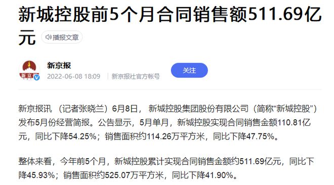 今年6月8日,新城控股集团股份有限公司(简称“新城控股”)发布5月份经营简报。公告显示,5月单月,新城控股实现合同销售金额110.81亿元,同比下降54.25%;销售面积约114.26万平方米,同比下降47.75%。