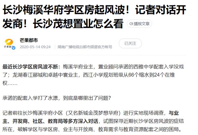 长沙梅溪华府小区(又名新城金茂梦想华府)因小区学位问题被业主质疑虚假宣传。