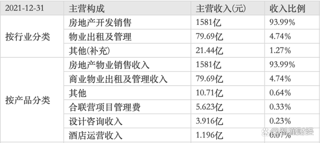 而且即便如此,从新城营收构成来看,2021年新城近94%的营收仍由以房地产开发贡献,物业出租及管理和其他贡献率仅6%左右。