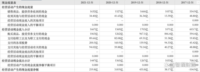 2021年公司购买商品、接受劳务支付的现金为1063亿元,同比减少了近200亿元,由此带动全年经营现金流净流入219.8亿元,同比增加216亿元。往年该项指标波动大抵也与此有关。