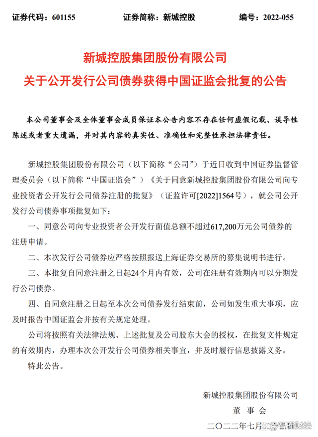 今年5月份,新城发行了一笔规模10亿元,票面利率6.5%的中期票据。此后,新城控股拟发行的一笔规模不超过61.72亿元的公司债也于近日获批。
