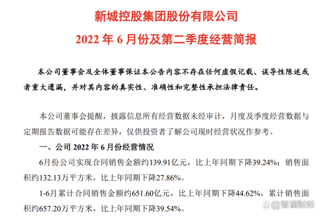 从新城控股披露的6月份经营情况来看,6月单月新城实现合同销售金额约139.91亿元,比上年同期下降39.24%。整个上半年新城累计合同销售金额约651.60亿元,比上年同期下降44.62%。