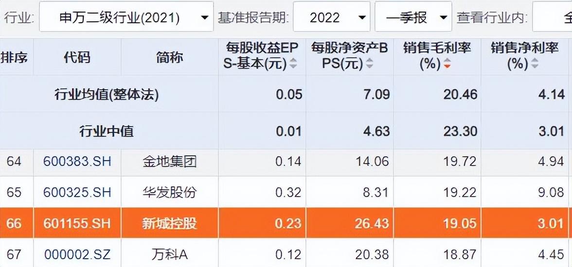 数据显示,新城控股一季度营收排在房地产开发板块第5位,但净利润只排在第16位,与其净利润排位相仿的荣安地产,营收甚至只有新城控股的1/5。不仅如此,新城控股的毛利率更是只排在第66位,与营收规模相似的金地集团不相上下。