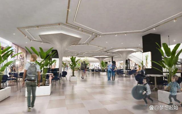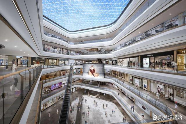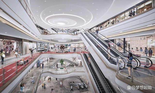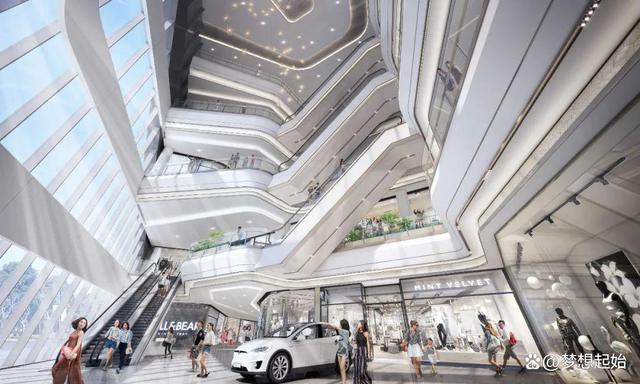 南中庭:通过将入口空间打开,将扶梯归于一侧,形成一个五层通高的空间,让空间更整体、大气。中庭地面结合室内外2米结构高差情况,运用梯田的元素,打造一个有多层次的空间。南中庭天花吊挂一组灯光装置,可通过程序控制展现各种光影的变化和流动。其它空间主要通过增加不同的灯饰和灯光装置,强调和突出硬装的主题,展现光影流动中的百变城市。