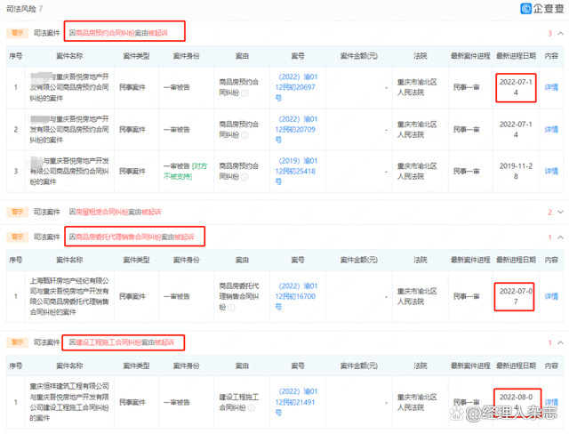 值得指出的是,去年10月、12月,该开发商因违法建设、占用消防车道分别被处罚8.93万元、0.5万元。在今年7月、8月,该开发商还因商品房预约合同纠纷、商品房委托代理销售合同纠纷、建设工程施工合同纠纷等被起诉,即被业主、中介公司、建筑方给告了。