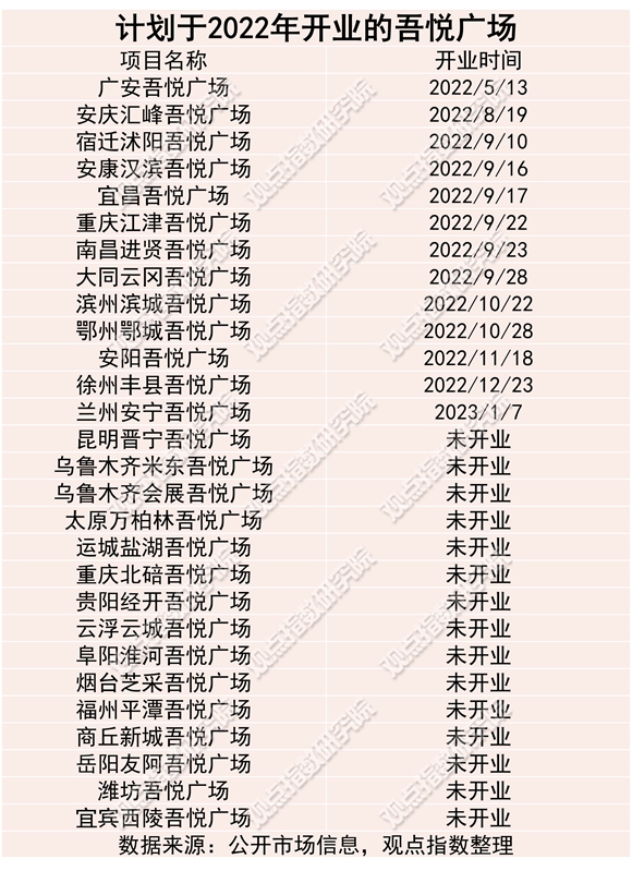另据观点指数不完全统计,2022年吾悦广场已开业12座,另有两个吾悦广场周边商业街项目:淄博吾悦广场嘉悦里金街、延安吾悦广场璀璨天街。