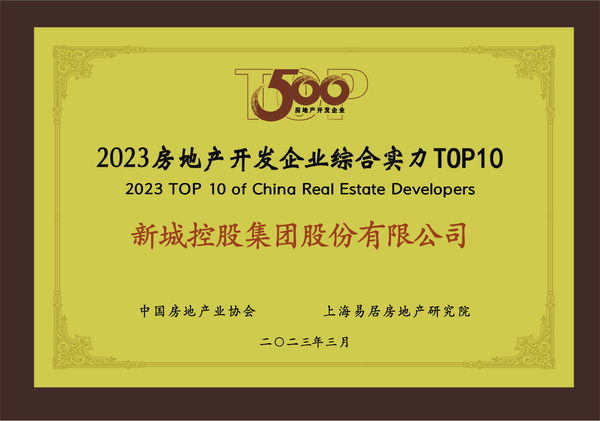 2023年3月23日,由中国房地产业协会、上海易居房地产研究院联合主持的“2023房地产开发企业综合实力TOP500测评成果”正式发布,本次测评成果显示,新城控股集团股份有限公司荣获“2023房地产开发企业综合实力TOP10”。