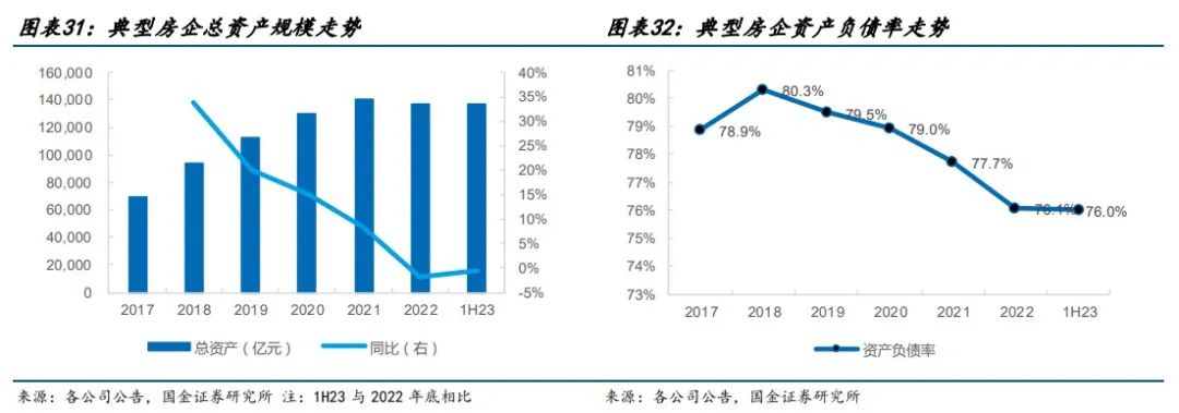 总的来看,截至2023年中期,这18家典型房企资产总额约13.68万亿元,较期初下降 0.6%;整体资产负债率76.0%,较2022年底降低0.1个百分点。
