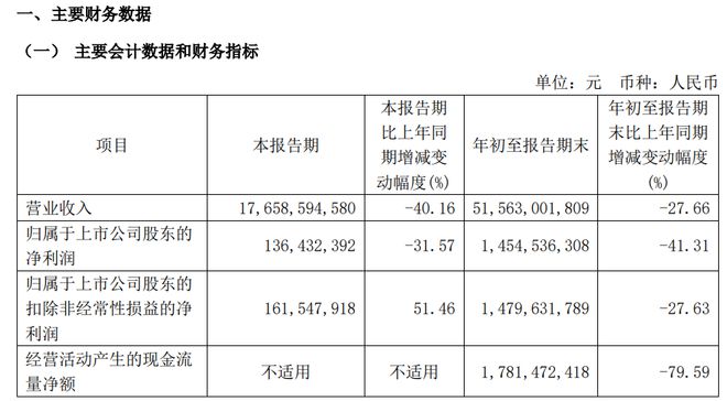 归属于上市公司股东的净利润为14.55亿元,同比下降41.31%。其中,公司第三季度实现营业收入176.59亿元,同比下降40.16%;