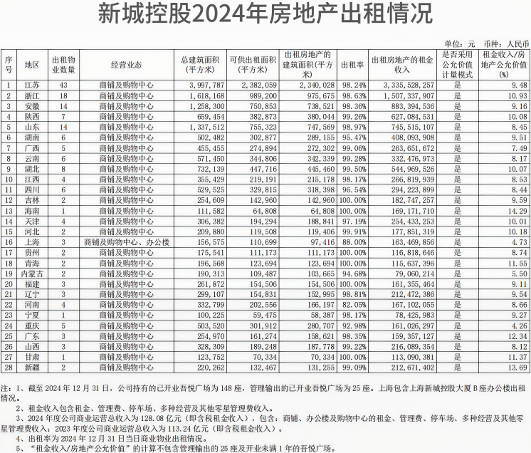 2024年数据,印证了商业不动产的支柱地位。年报显示,2024年,新城控股商业运营总收入达128亿元,同比增长13.1%,超额完成125亿元年度目标。物业出租及管理业务毛利率达70.17%,毛利贡献占比升至47.89%,与地产开发业务基本持平,148座自持吾悦广场已成为利润核心。