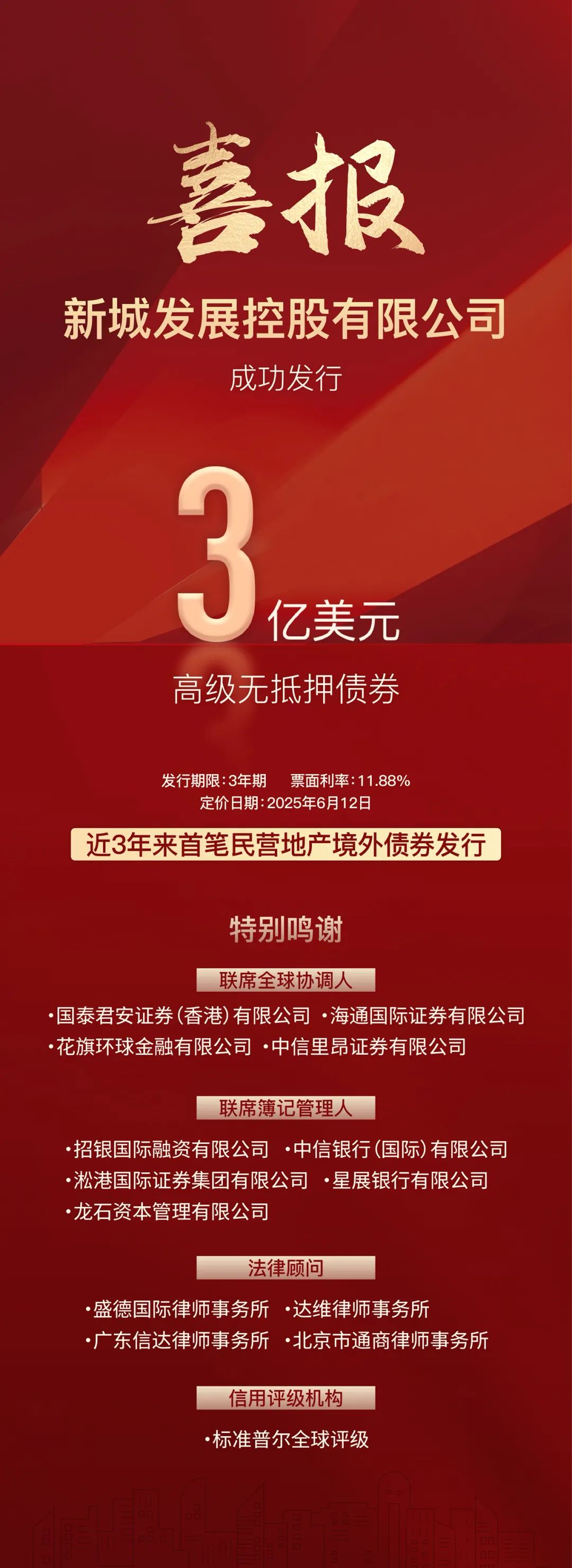 喜报|新城控股母公司新城发展成功发行3亿美元境外债