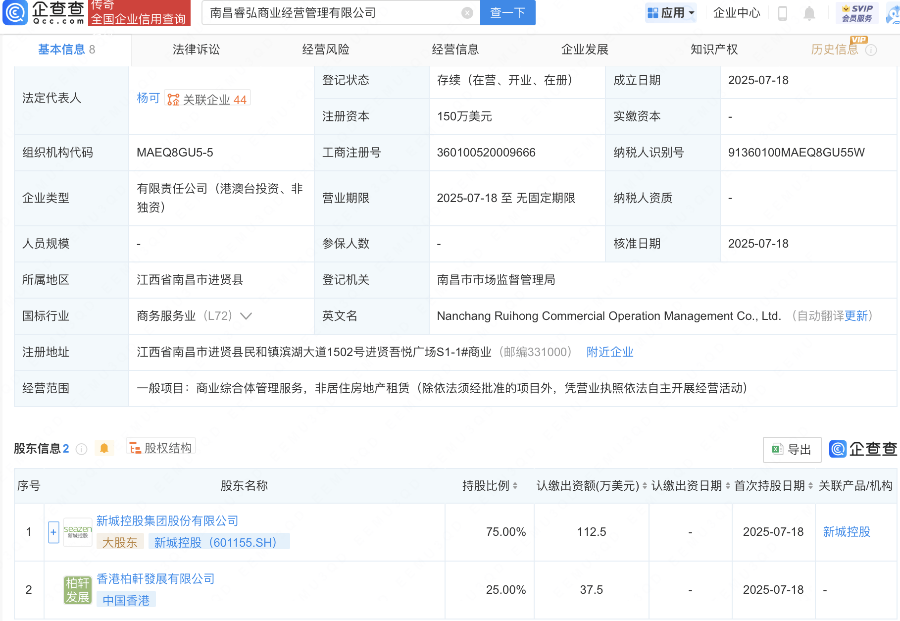 近日,南昌睿弘商业经营管理有限公司成立,法定代表人为杨可,经营范围包含:商业综合体管理服务,非居住房地产租赁。该公司由新城控股(601155)等共同持股。