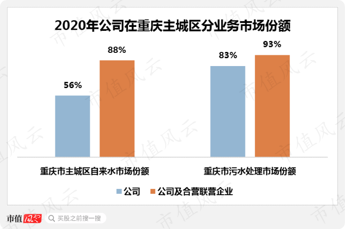 具体来说,2021H1公司占重庆市主城区约56%的自来水市场和重庆市约83%的污水处理市场;公司及合营联营企业共同占重庆市主城区约88%的自来水市场和重庆市约93%的污水处理市场。