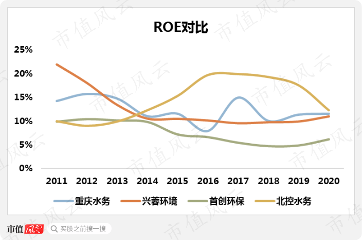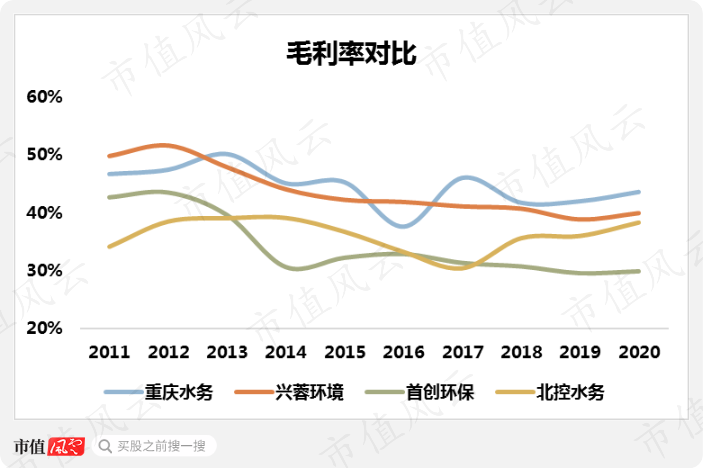 横向对比来看,近十年来公司的毛利率基本处于各可比公司最高水平,以2020年为例,公司的毛利率分别高出兴蓉环境(000598.SZ)、北控水务(0371.HK)4及5个百分点,高出首创环保(600008.SH)14个百分点。
