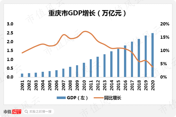 2001-2020年,重庆市GDP由0.2万亿元持续增长至2.5万亿元,十年间CAGR为12%。
