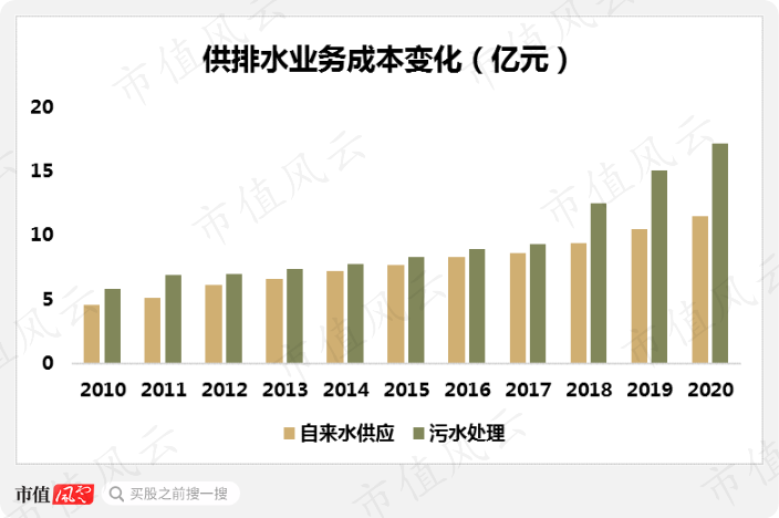 利润端的低增长主要是成本增长较快所致。供排水业务成本中,折旧及摊销、人工、电耗合计占比超过80%(以2020年计),2010-2020年供水成本CAGR为10%,同期排水成本CAGR为11%,均超过同期收入端增速。