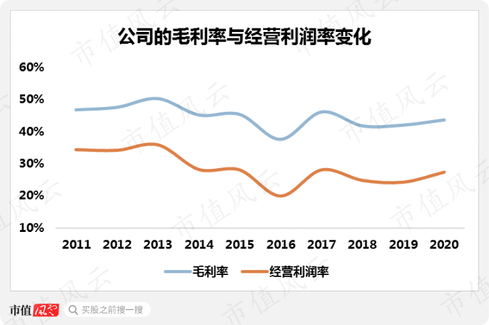 2011年以来,公司的毛利率呈现下降态势,由47%下降了3个百分点至2020年的44%。与此同时,公司的经营利润率由34%下降了7个百分点至27%。